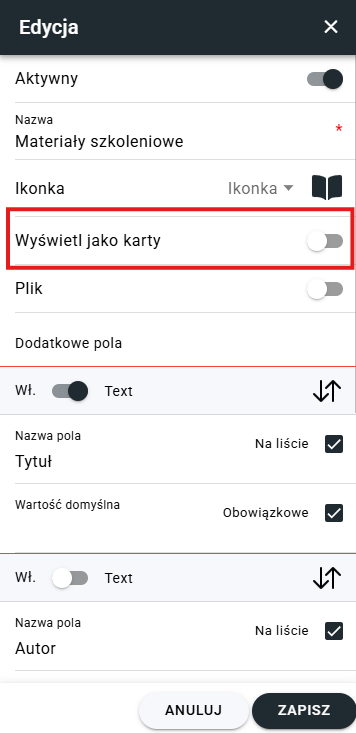 Przejdź do: Ustawienia → Moje typy dokumentów. Wybierz typ i zaznacz/odznacz opcję Wyświetl jako karty.